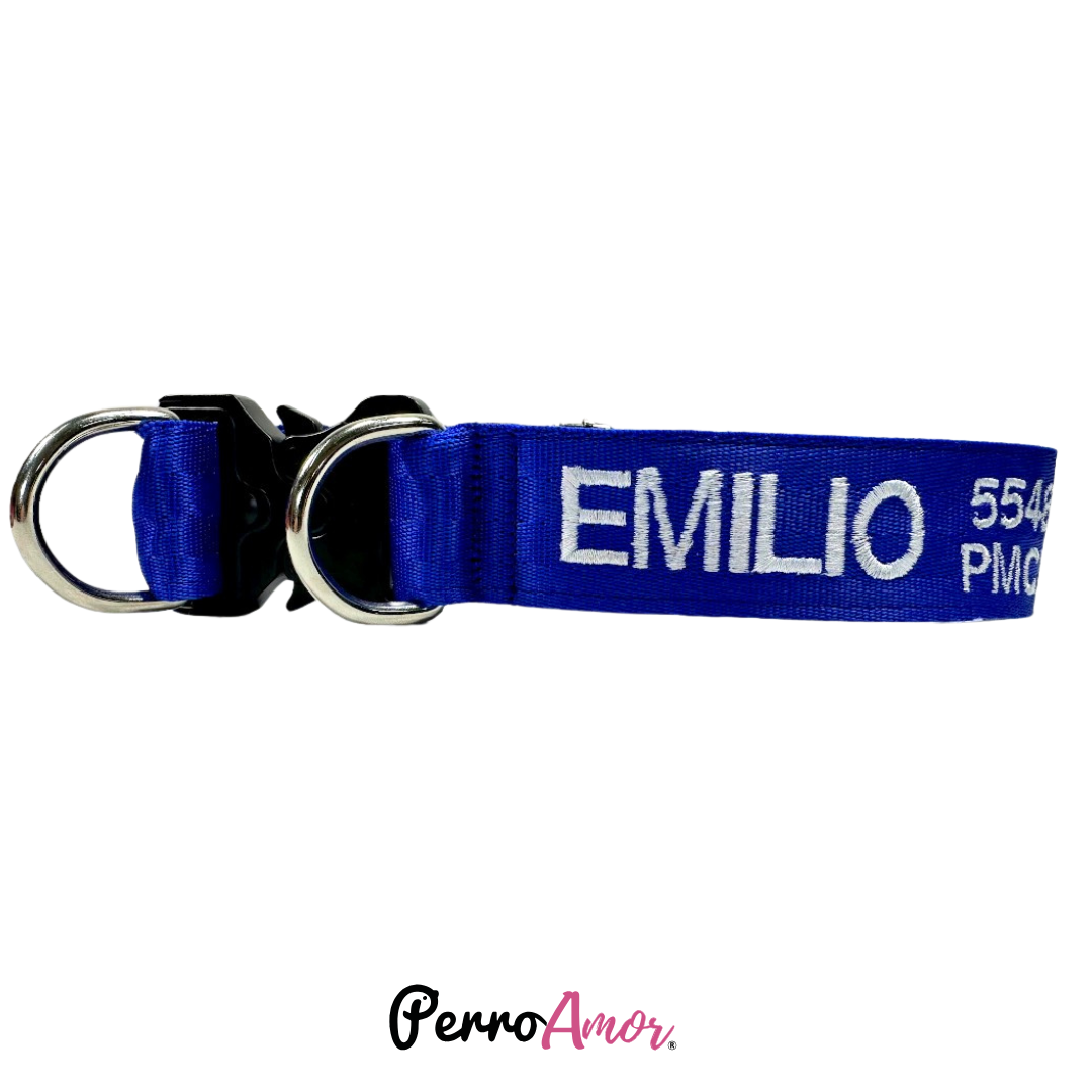 Solo esta disponible en un ancho de 3.8 cm y esta reforzado con un broche táctico de metal de alta calidad protegido por 2 argollas de acero soldadas para mayor resistencia las cuales se conectan con la correa. La combinación permite una alta capacidad de tensión para soportar el peso de tu perro, jalones repentinos cuando se emocione demasiado y a cualquier fuerza que pueda ejercer tu perro, evitando que el broche reciba toda la tensión.