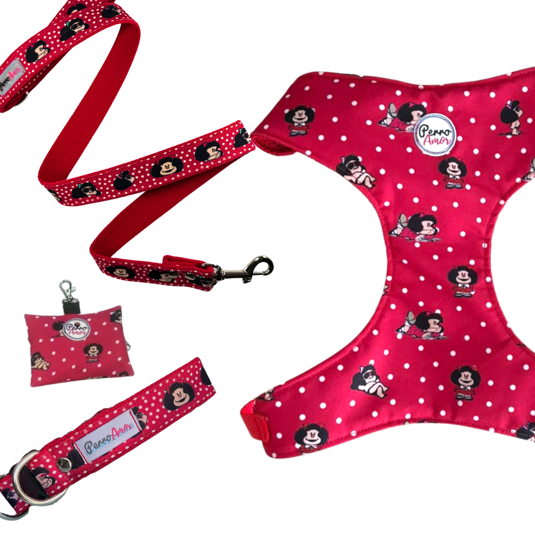En este Kit encontrarás todos los productos del mismo diseño. Incluye Collar Vida Mía, Correa Pata de Perro, Pechera y Dispensador del Bolsitas.