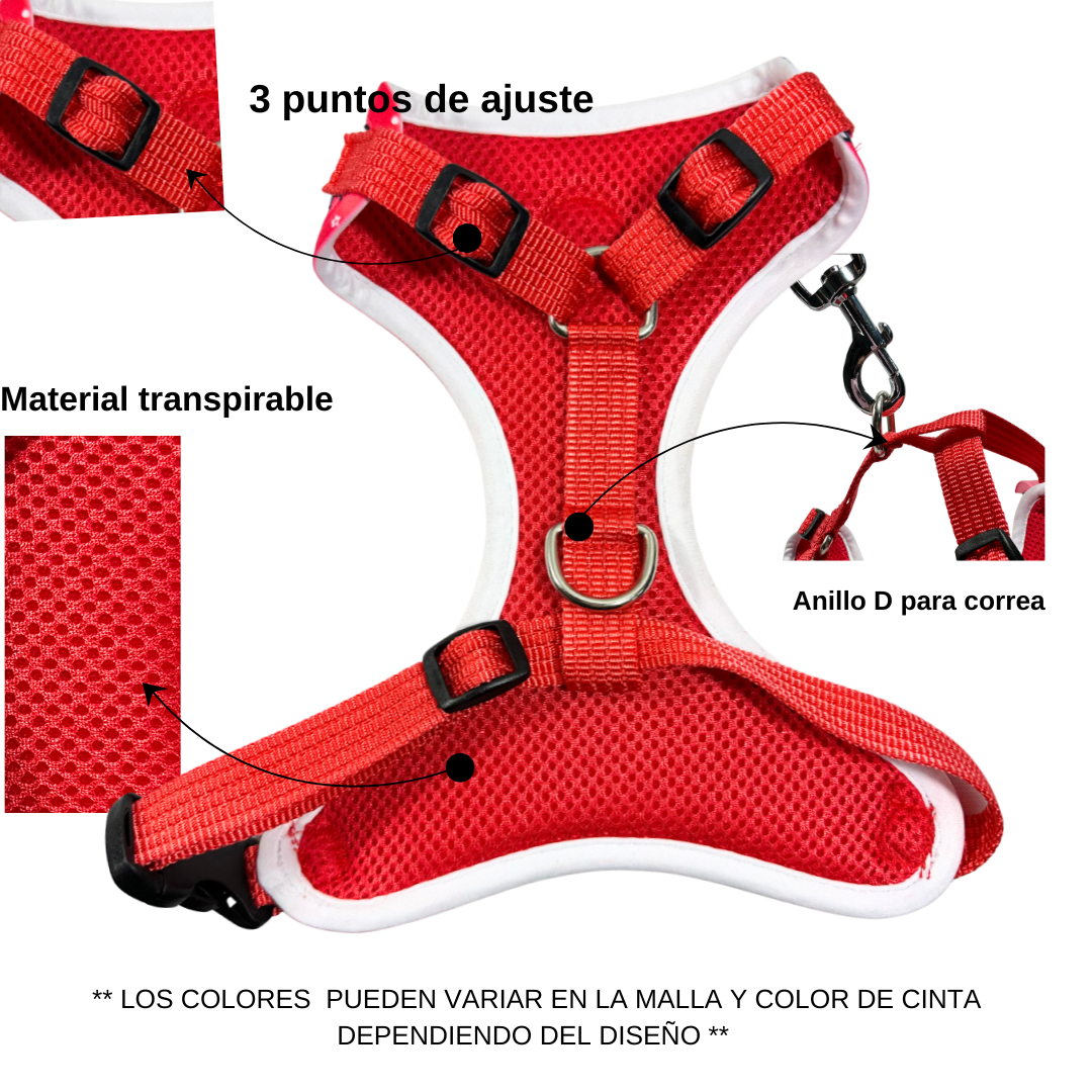 Nuestra Pechera para perro tiene un diseño increíble en la parte frontal para que tu perrito nunca pierda el estilo, en la parte interior tiene una delgada esponja para que sea más cómoda y finalmente está cubierta con una malla transpirable, en la parte exterior usamos un material suave que evita que se lastime. Incluye cinta de nylon, una argolla circular y 3 puntos ajustables. Tiene un “D ring” el cual se conecta con la correa y un broche tiempo samsonite.