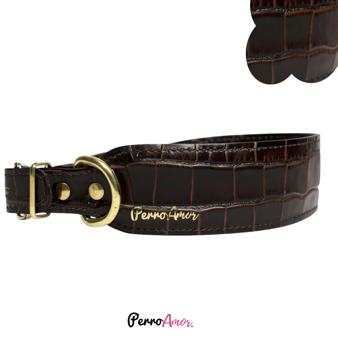 Este collar esta fabricado en piel de res con un troquelado de charoL tipo cocodrilo, este elegante diseño es ideal para perros de cuello grande, con mucho pelo que quieran destacar su elegancia.