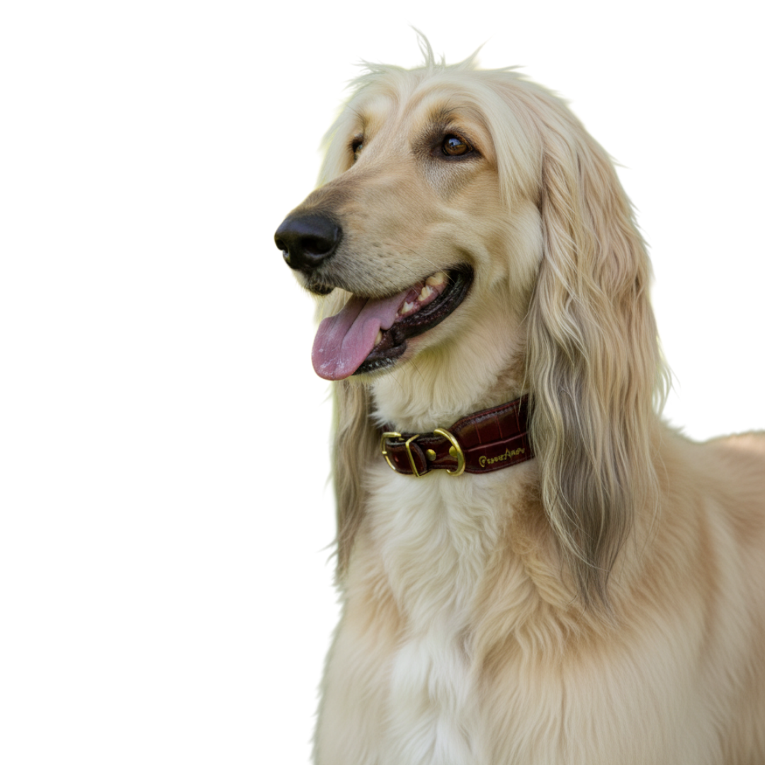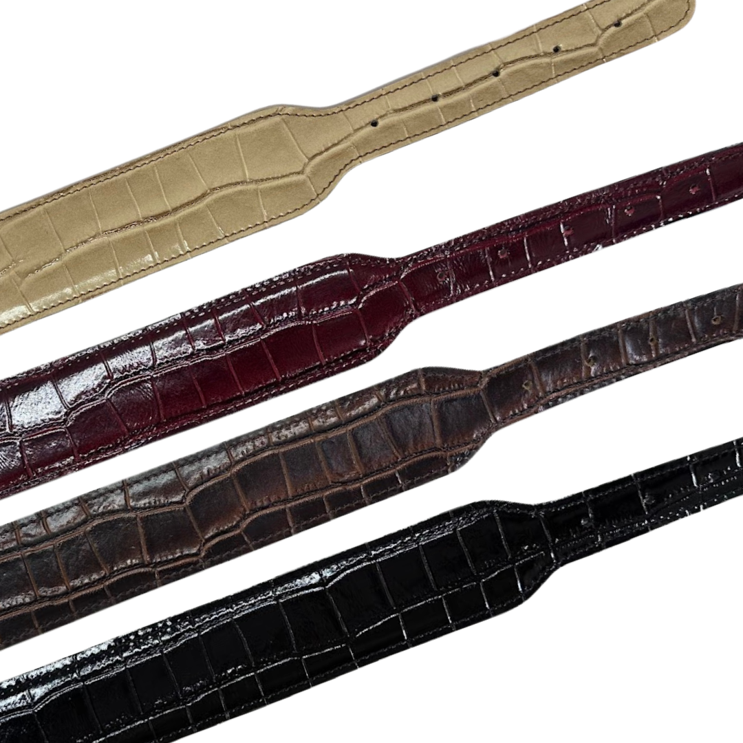 Este collar esta fabricado en piel de res con un troquelado de charoL tipo cocodrilo, este elegante diseño es ideal para perros de cuello grande, con mucho pelo que quieran destacar su elegancia.